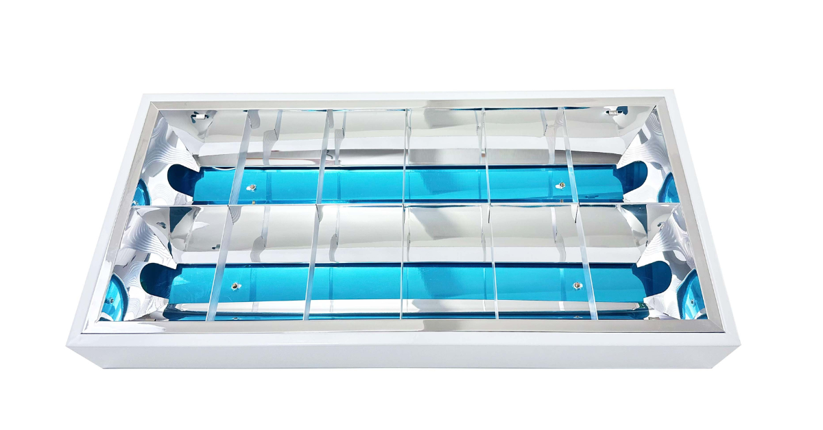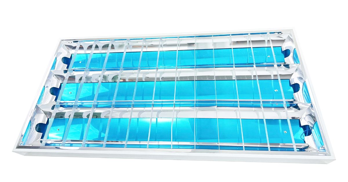 โคมไฟตะแกรงแบบติดลอย เป็นโคมติดลอย ขั้วหลอดเป็นแบบโรเดอร์ล็อค มีแผ่นสะท้อนใต้หลอด จะให้การกระจายแสงได้มากขึ้นให้ความเงางามยาวนาน ช่วยทำให้บริเวณที่ติดตั้งโคมนี้ สามารถควบคุมการกระจายแสงให้มีประสิทธิภาพมากขึ้นเหมาะสำหรับใช้ภายในสำนักงาน